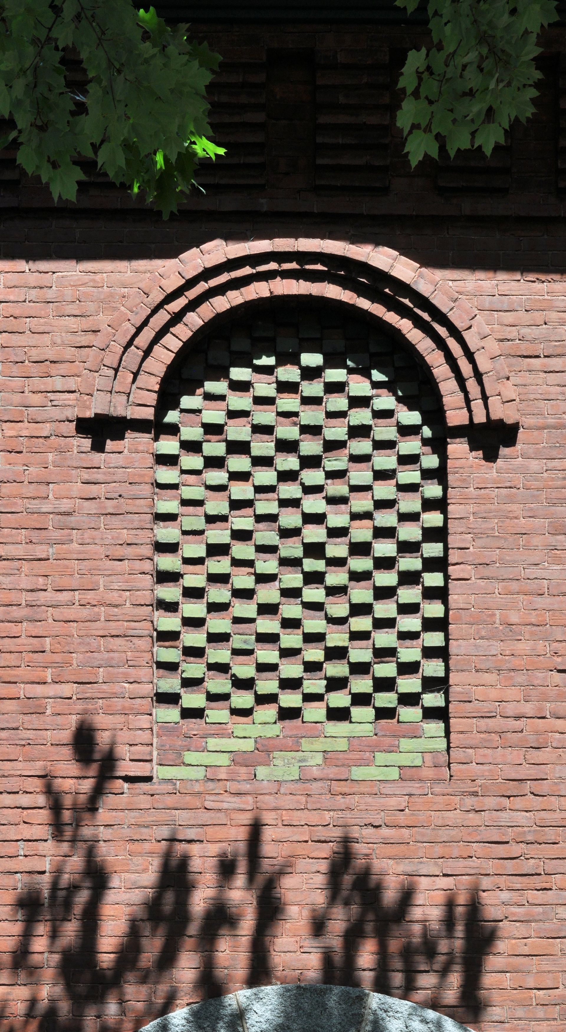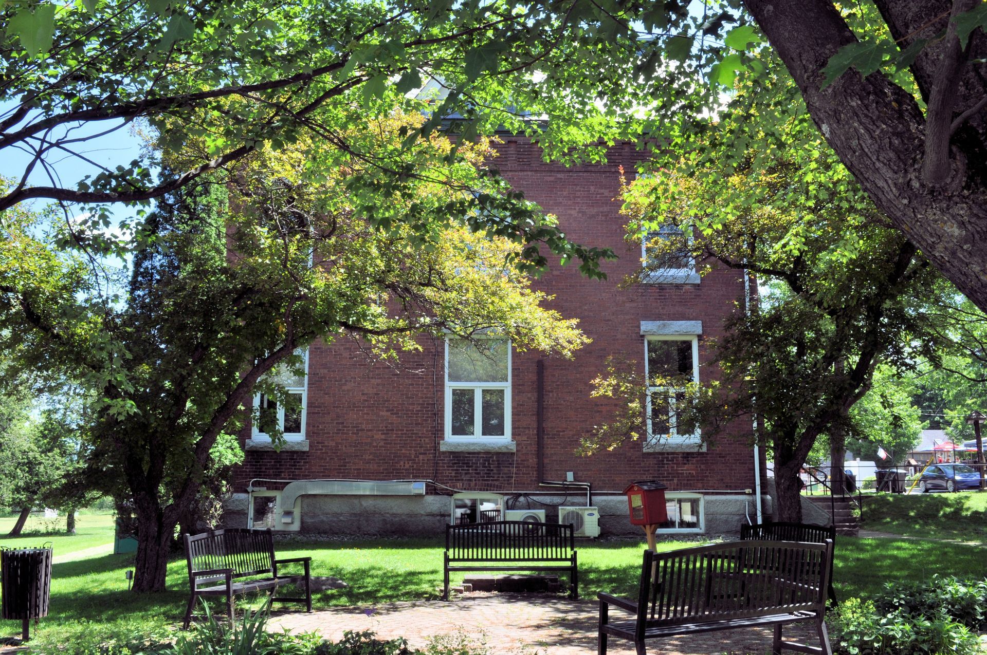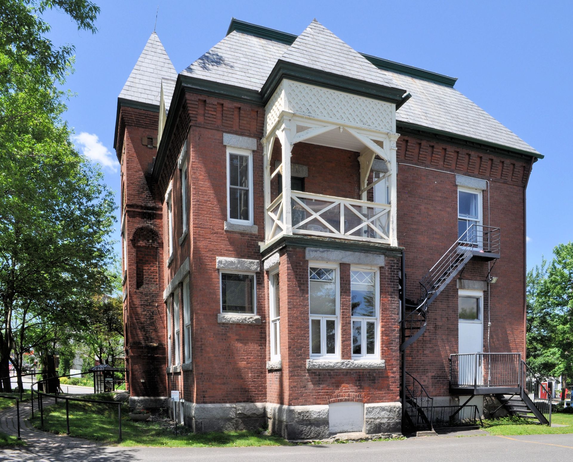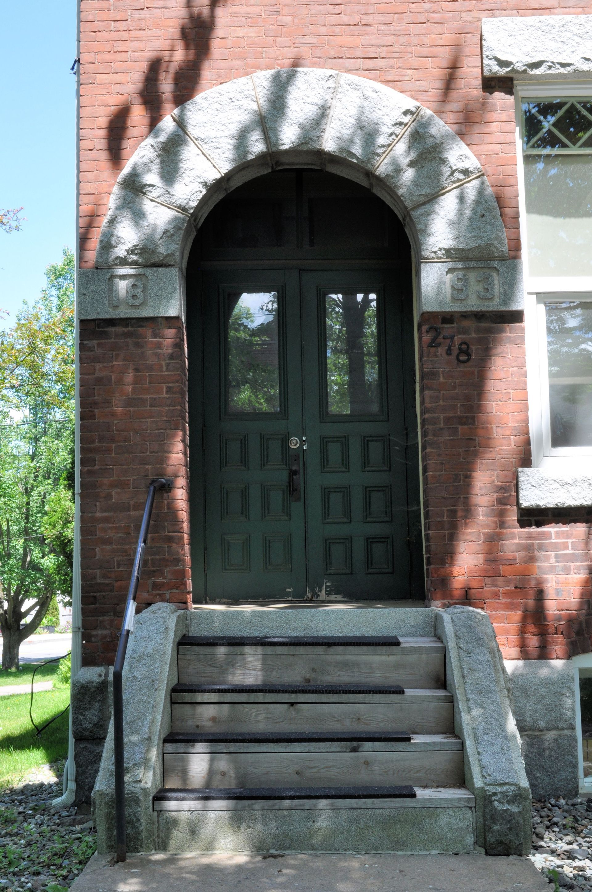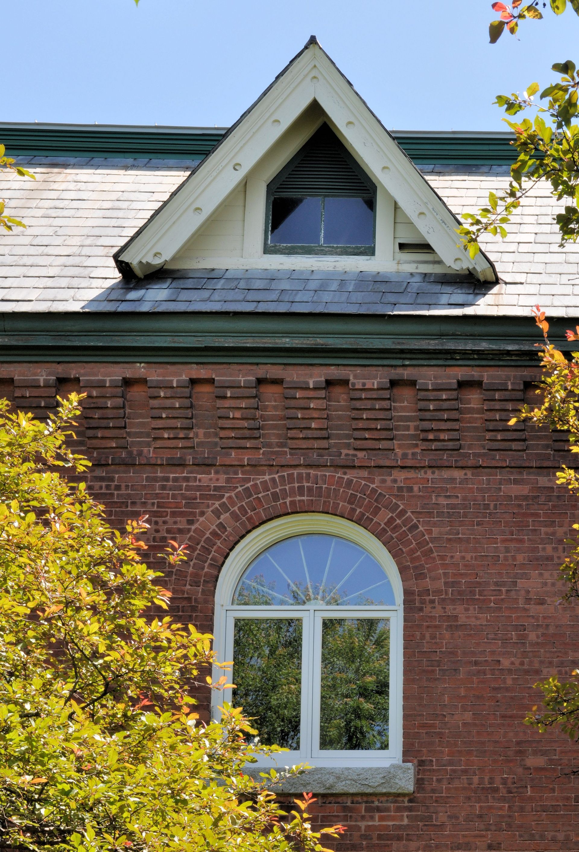 La bibliothèque était très élégante pour l'époque et reste aujourd'hui un bâtiment historique d'une beauté saisissante. Structurellement, il s'agit d'un bloc de briques rouges de 2½ étages avec un toit mansardé et une tour centrale. Quelques autres caractéristiques importantes : le bâtiment présente des fondations et des appuis de fenêtre en granit ; des lucarnes triangulaires dans la mansarde ; deux entrées arquées proéminentes, subtilement différenciées par les matériaux des voussoirs (une pierre en forme de coin ou effilée utilisée pour construire un arc). Le motif de l'arc se répète au deuxième étage, souligné par un changement prononcé dans le motif de la brique. Un motif de brique ludique se trouve également juste sous la ligne de toit.