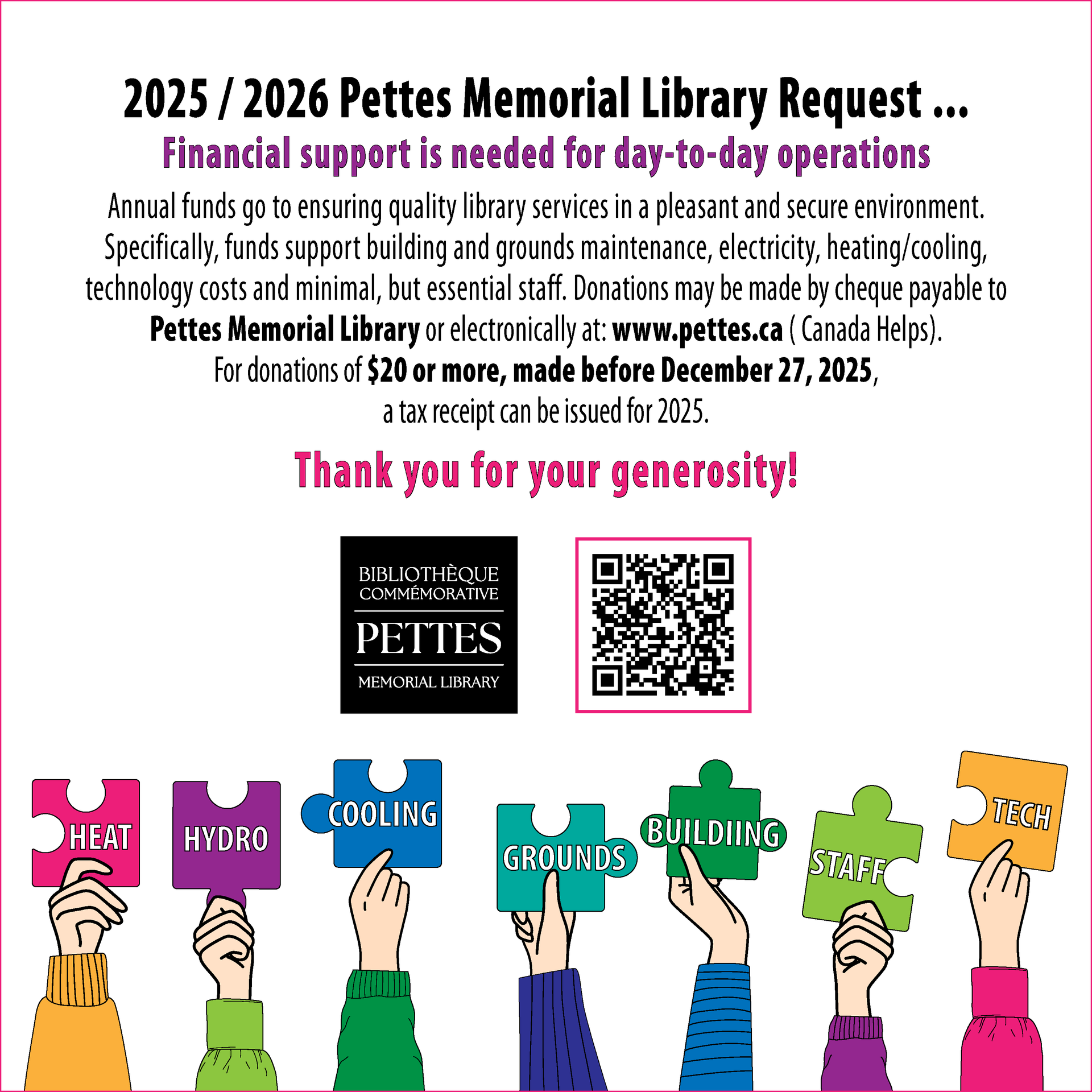 - By cheque: Payable to Pettes Memorial Library (Expansion Project).