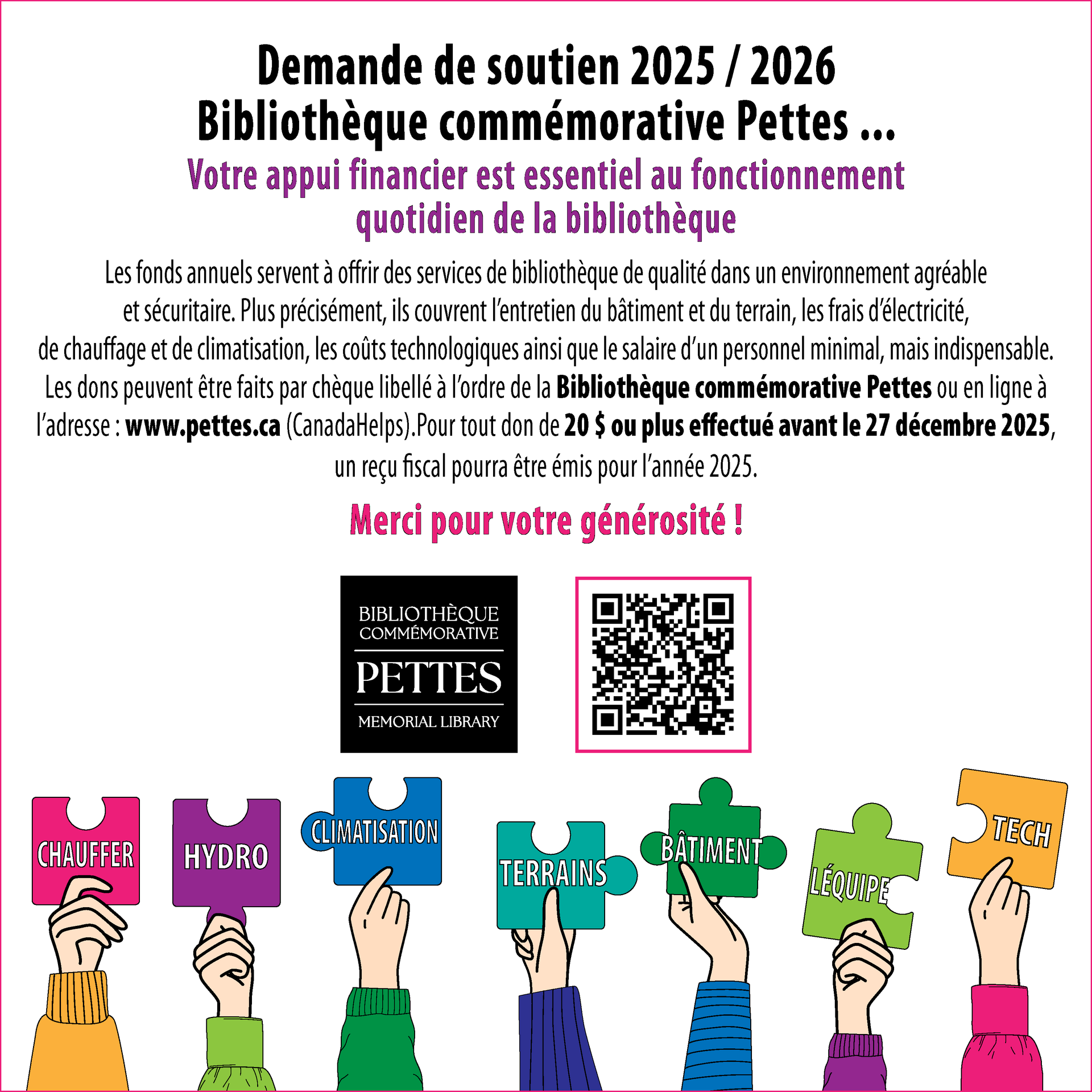 - par chèque, payable à la Bibliothèque commémorative Pettes (projet d’expansion).