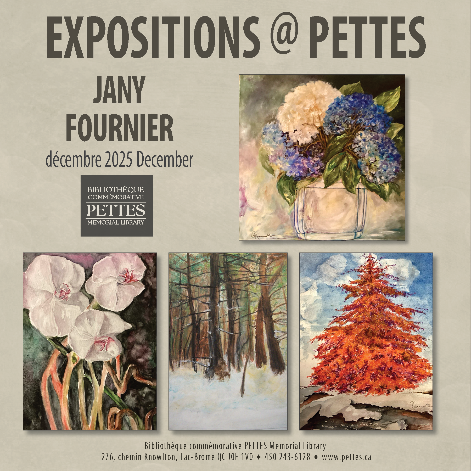 Jany Fournier studied drawing, painting, and sculpture at the Montreal School of Fine Arts. She holds a bachelor’s degree in education and visual arts, specializing in pictorial and spatial organization. Her career has been primarily in art education in Montreal, while also participating in numerous exhibitions and artistic events, including the Tour des Arts in the Eastern Townships from 2005 to 2021.