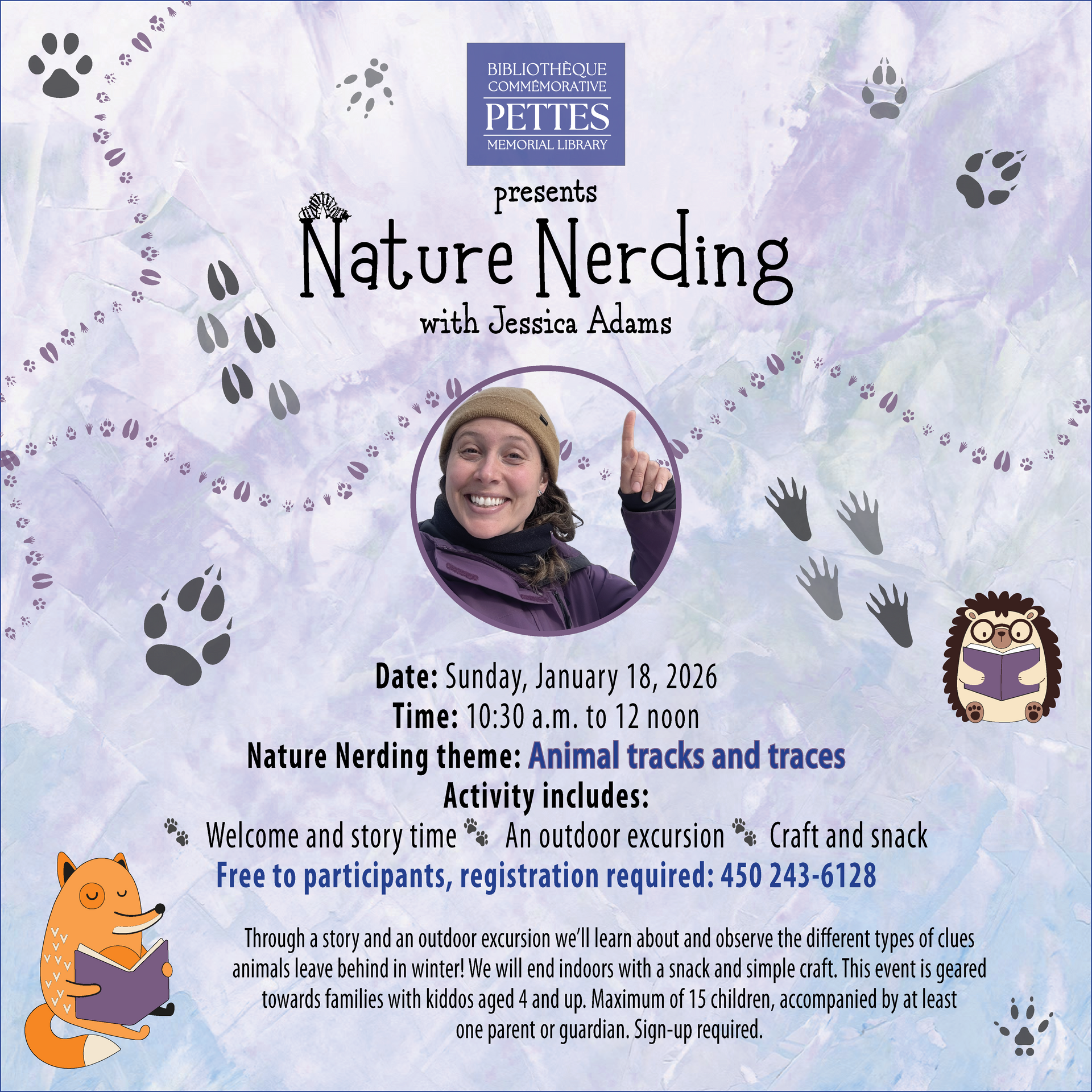 Through a story and an outdoor excursion we’ll learn about and observe the different types of clues animals leave behind in winter! We will end indoors with a snack and simple craft. This event is geared towards families with kiddos aged 4 and up. Maximum of 15 children, accompanied by at least one parent or guardian.